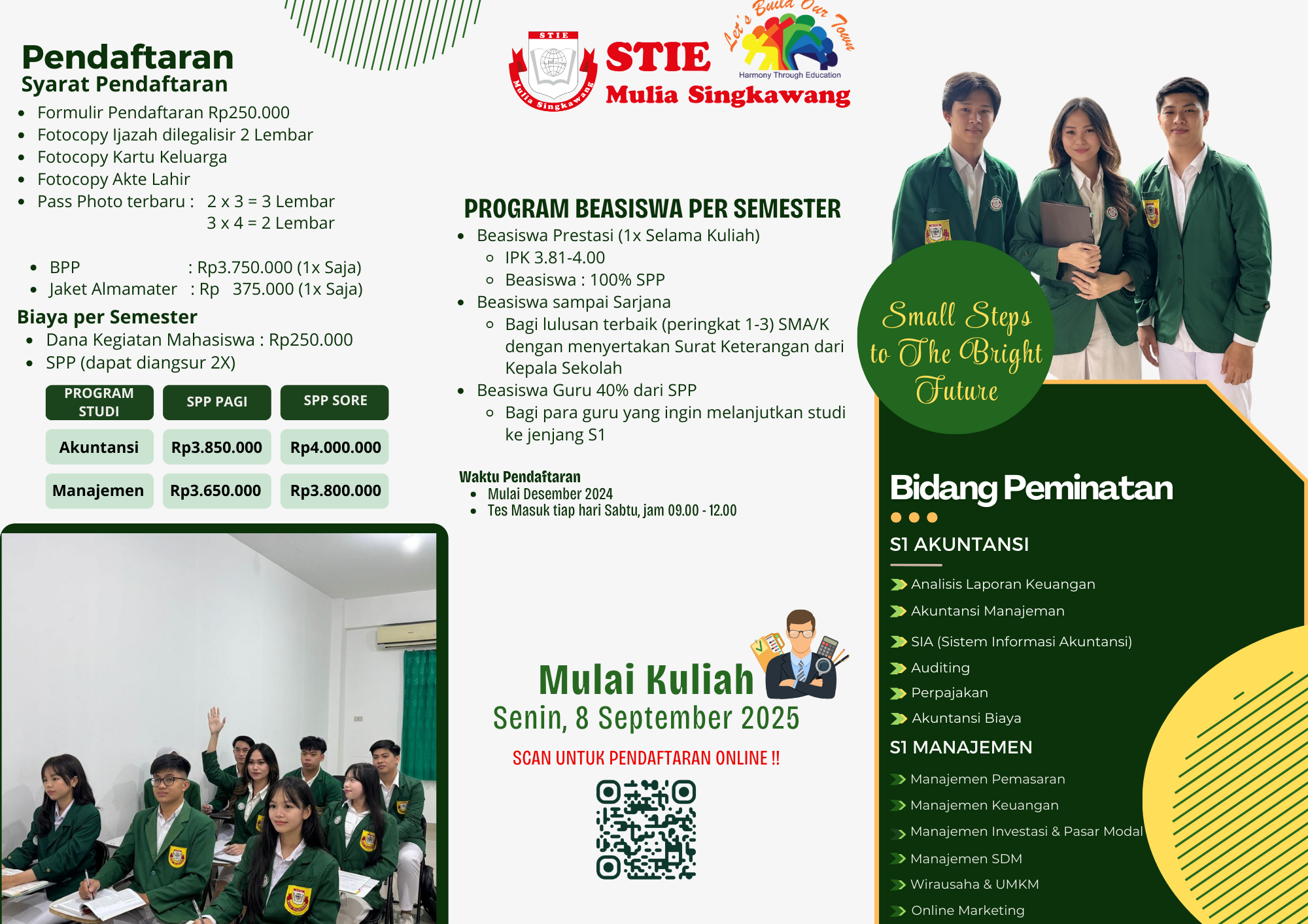 Bagi yang belum bisa hadir di expo, jangan khawatir! Pendaftaran kuliah di STIE Mulia Singkawang tetap dibuka secara online! Cukup klik link berikut untuk daftar sekarang: https://bit.ly/FormulirPendaftaranMahasiswaBaruSTIEMuliaSingkawang.